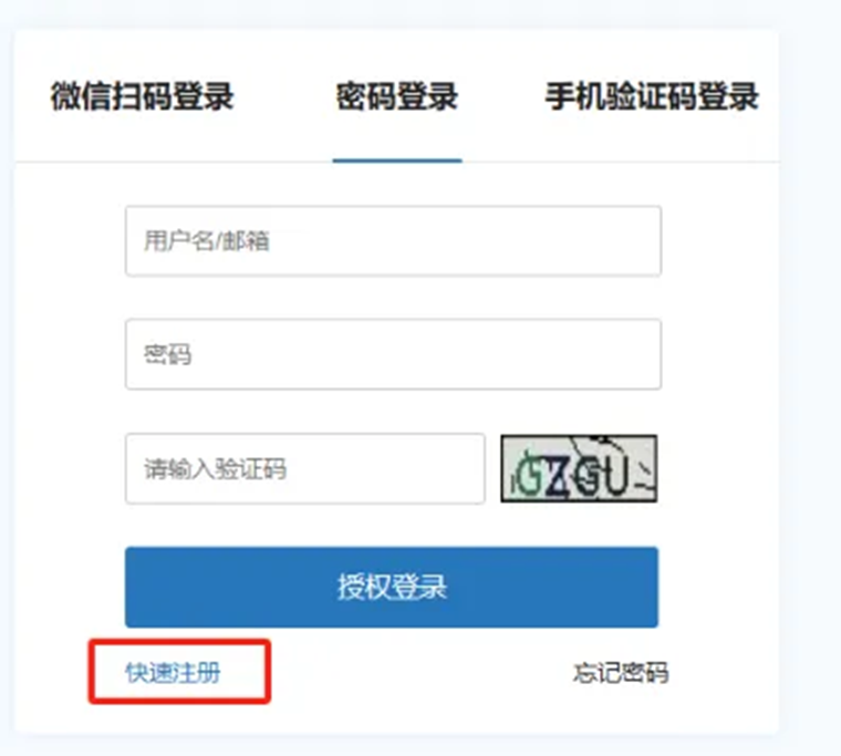 第二步:“密码登录”左下方点击“快速注册”。