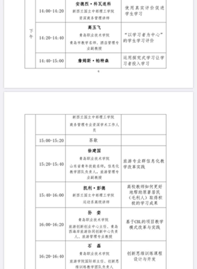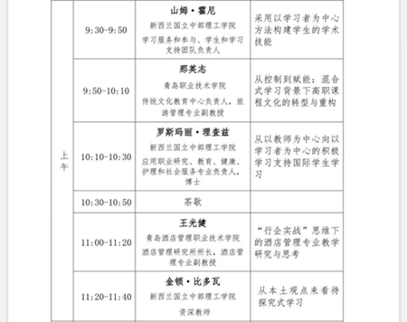 此次研讨会特邀6 名获得新西兰政府“2018年度卓越教师奖”的教师、青岛职业技术学院及兄弟院校在职业教育教学方法改革方面有经验的教师进行主题发言并就教学改革与创新、教学方法的应用以及实用教学案例进行现场交流。研讨会为期一天,安排紧凑,中英文学术报告交叉呈现。研讨会中英文学术汇报安排如下: