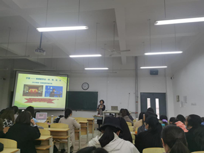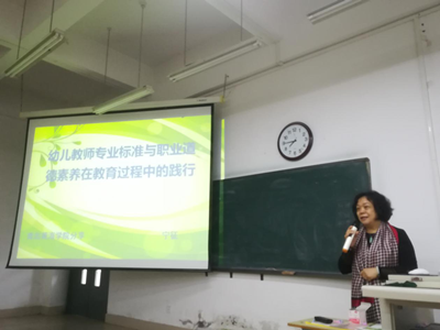 讲座伊始,宁教授阐述了幼儿教师专业标准和职业素养在教育过程中的践行总体思路。宁园长首先给师生举例了近几年在幼儿教育中存在的问题,并针对这些问题做出了分析,引出了讲座的主题:幼儿教师的专业标准和职业素养在实践中的实施以培养德才兼备的幼儿教师。宁园长从以下几个方面展开:一是《幼儿教师专业标准》的价值定位及指导思想,向我们介绍了基本要求、基本规范、基本准则等;二是基本理念贯穿于学前教育的全过程,提出了幼儿教师的专业性由幼儿的年龄特点所决定,幼儿教师应具备基本的学前教育专业基本知识和技能,强化提升自己的能力,提升专业水平。幼儿教师应立足于为人师表,言传身教的岗位特点,勤于实践和反思,使自己组织、管理、协调、创新能力得到全面提升;三是结合大量的幼儿园教师发展案例深入浅出地分析了在实践中如何深度学习贯彻《幼儿教师专业标准》,从而全方位提升专业素养,树立高尚的职业情操。