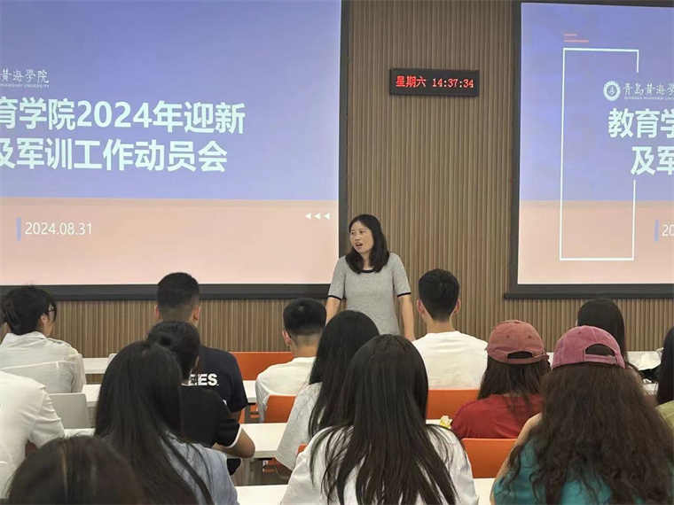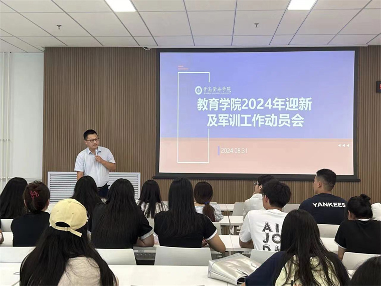 随着初秋的脚步悄然而至,教育学院迎来了充满活力与梦想的2024级新生。为了做好迎接新生及军训工作,确保新生顺利适应大学生活并提升身体素养,教育学院于2024年8月31日在知信楼133召开教育学院2024年迎新及军训工作动员会。教育学院常务副院长周萍,院长助理张龙洁,24级新生全体辅导员和24级新生班助及教官参与此次动员会。