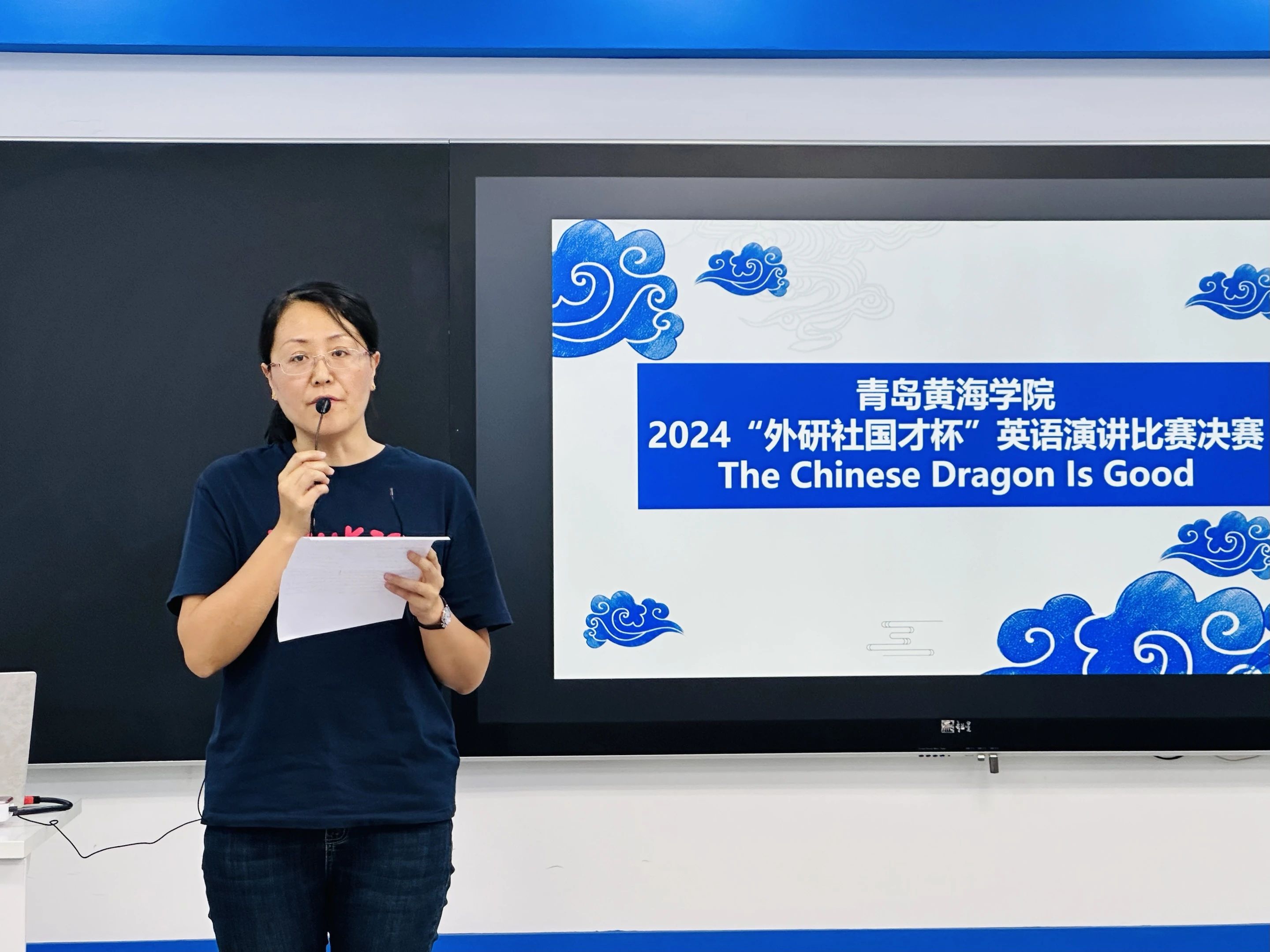 决赛于5月29日下午14点30分在知行楼301智慧教室举行,比赛开始前,主持人左欣、全莉老师介绍到场的嘉宾和评委,语言文化学院副院长武学锋致演讲辞,并宣布演讲比赛正式开始。比赛分为英语专业组赛道和非英语专业组赛道,按照赛前的抽签顺序,参赛选手依次用流利的英文介绍自己所理解的“中国龙”精神。演讲结束后,曹晓玮、毛晓群老师根据选手的演讲内容进行提问。每位学生演讲结束后,评委老师对每位选手进行打分,在去掉一个最高分和一个最低分后,对选手的最终成绩进行排名。