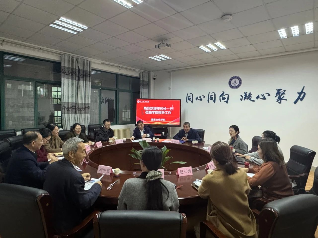 11月20日下午,李清山校长带队到语言文化学院进行调研并指导工作,发展规划处处长臧琰琰、综合办公室副主任杨晓磊、综合办公室科员冯祥陪同调研。语言文化学院领导班子参加此次会议。