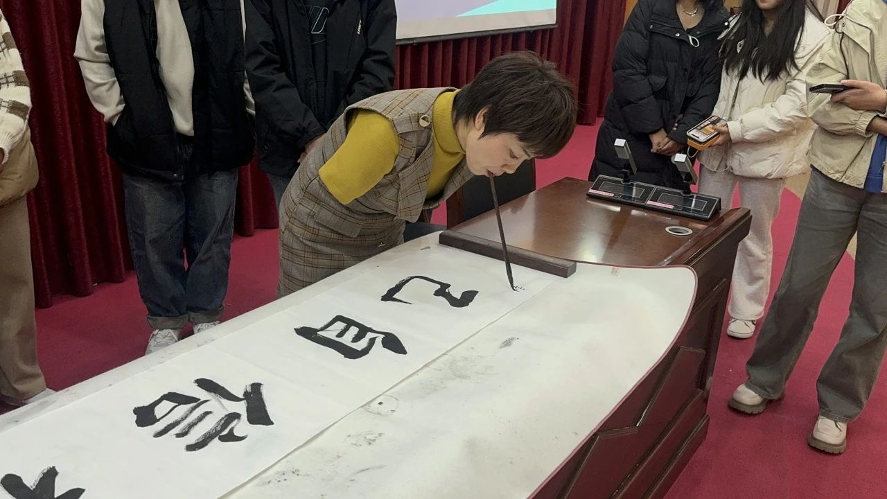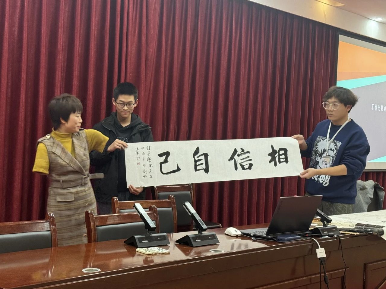最后,刘老师衔起毛笔,以口代手,为语言文化学院泼墨写下一副书法作品——“相信自己”。其字迹如铁画银钩,力透纸背,凝聚着她对语言文化学院广大学生的殷切期待。