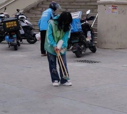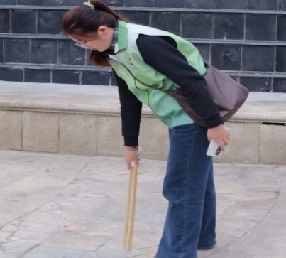 本次活动的志愿者们身穿统一的志愿服,手持着卫生清理工具,在校园外的路口道边俯下身清捡着道路上人们随手丢弃的烟头。