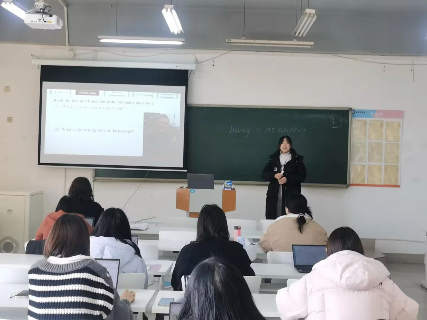 所有新英语老师的讲课节奏紧致,精彩纷呈。她们充分利用多媒体教学手段,展示丰富的教学设计,清晰的教学目标,结合生动的案例和互动环节,使得课堂内容生动有趣。运用智慧平台辅助教学如U校园AI版的子言、学习通词云等助力学生高效学习英语让比赛现场成为教师切磋教学方法、展示教学能力、提升教学理念的平台,让每一位参赛教师通过比赛学到对促进自我专业成长有用的真东西。