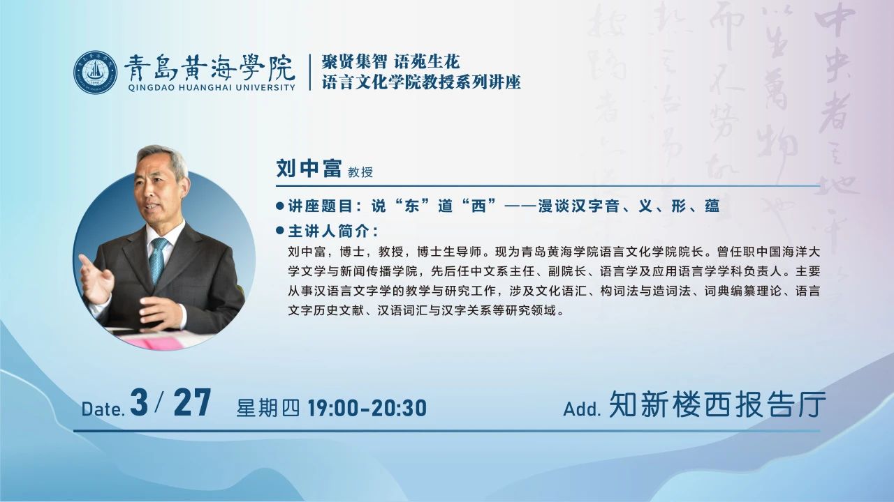 3月27日晚,由语言文化学院主办的“聚贤集智 语苑生花”教授系列讲座之一《说“东”道“西”——漫谈汉字音、义、形、蕴》在知新楼西报告厅盛大开讲。主讲人语言文化学院院长刘中富教授以深厚的学术积淀,带领现场师生穿越汉字千年时空,系统解析汉字的形义密码与文化基因。中文系主任赵红梅教授、日语系徐哲根教授、朴京玉教授及中文系青年教师等出席讲座。语言文化学院汉语言文学、商务英语、日语专业的学生聆听了本场报告,讲座由赵红梅主任主持。