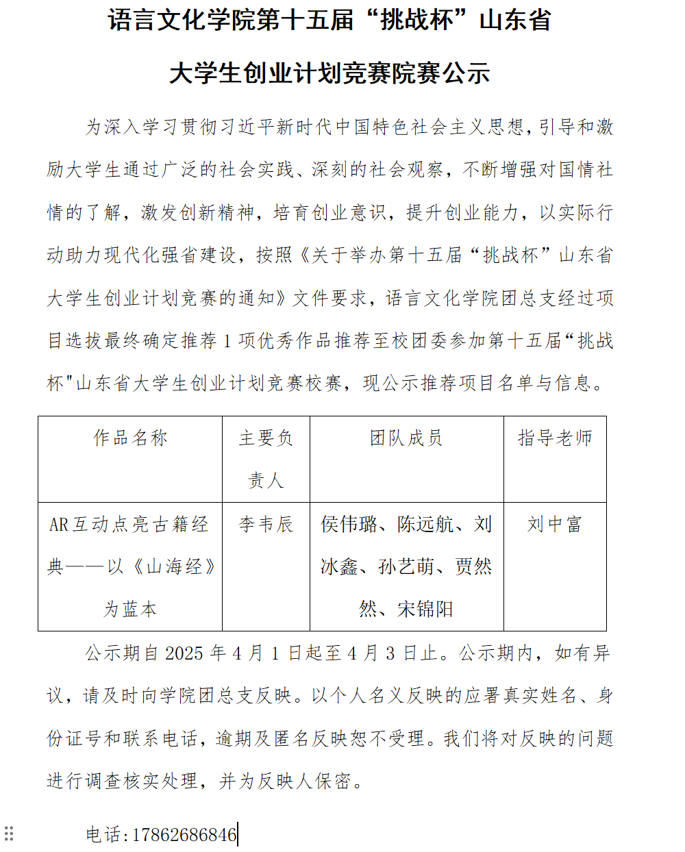 为深入学习贯彻习近平新时代中国特色社会主义思想,引导和激励大学生通过广泛的社会实践、深刻的社会观察,不断增强对国情社情的了解,激发创新精神,培育创业意识,提升创业能力,以实际行动助力现代化强省建设,按照《关于举办第十五届“挑战杯”山东省大学生创业计划竞赛的通知》文件要求,语言文化学院团总支经过项目选拔最终确定推荐1项优秀作品推荐至校团委参加第十五届“挑战杯”山东省大学生创业计划竞赛校赛,现公示推荐项目名单与信息。