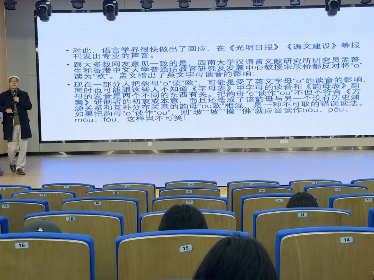 史冠新教授以近年在网络上热议不断的话题“‘o’究竟读‘欧’还是‘窝’”引入了本次讲座主题。他认为,争议的根源在于未从音节的角度加以考量,而究其本质,“o”是一个不能自成音节的单元音韵母,单独发音是做不到的。同样,汉语的声母也不能自成音节,因而传统的拼音教学法按照先声母再韵母的顺序进行教学存在着严重缺陷。于是,史冠新教授首创了“汉语音节本位拼音教学法”,将音节作为拼音教学的基本单位,主张应该先教能自成音节的韵母,而后在声母教学阶段,将声母置于“声母+已学韵母”构成的音节中进行学习和训练。这是因为声母本身不能自成音节,传统教学中读出来的是声母的呼读音而非本音,容易给学习者带来不必要的困惑。