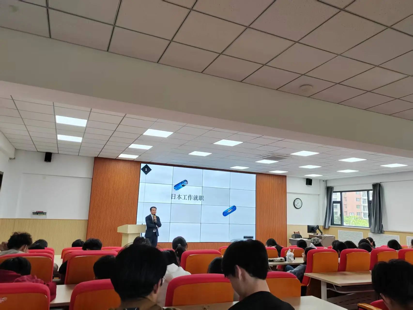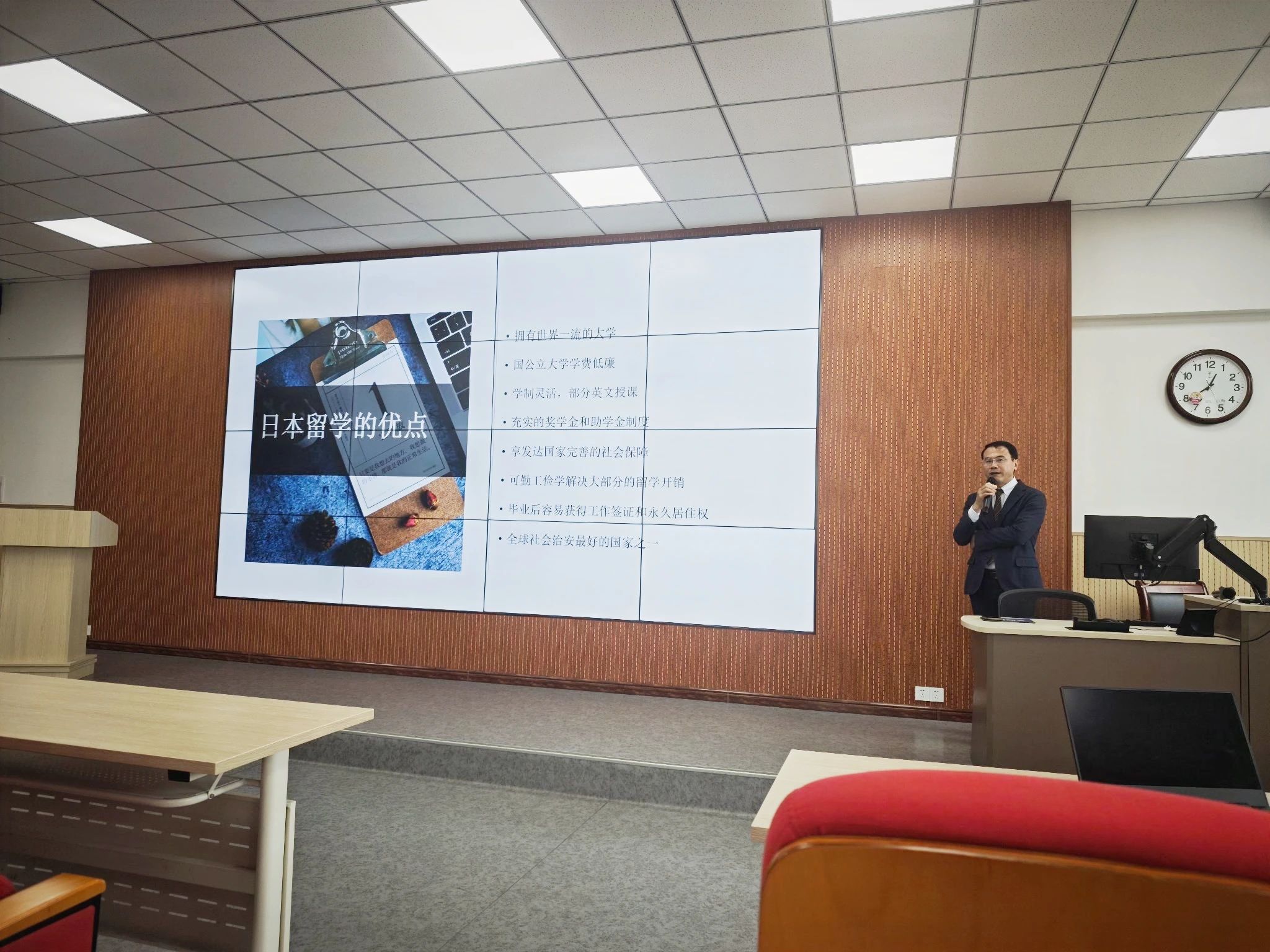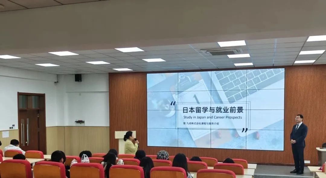 5月8日下午,九成株式会社社长葛锋在知新楼东配201教室,为语言文化学院日语专业学生带来了一场内容详实的留学宣讲会。葛锋社长首先介绍了赴日留学的优势,指出日本政府每年投入逾770亿日元支持留学生教育,推出包含奖学金、学费减免等优惠政策;留学生可享受与日本国民同等的医疗、就业等福利待遇。他还深入解读了《留学生30万人计划》及宽松的毕业就职签证政策,为有意向赴日发展的学生提供了清晰的路径规划。