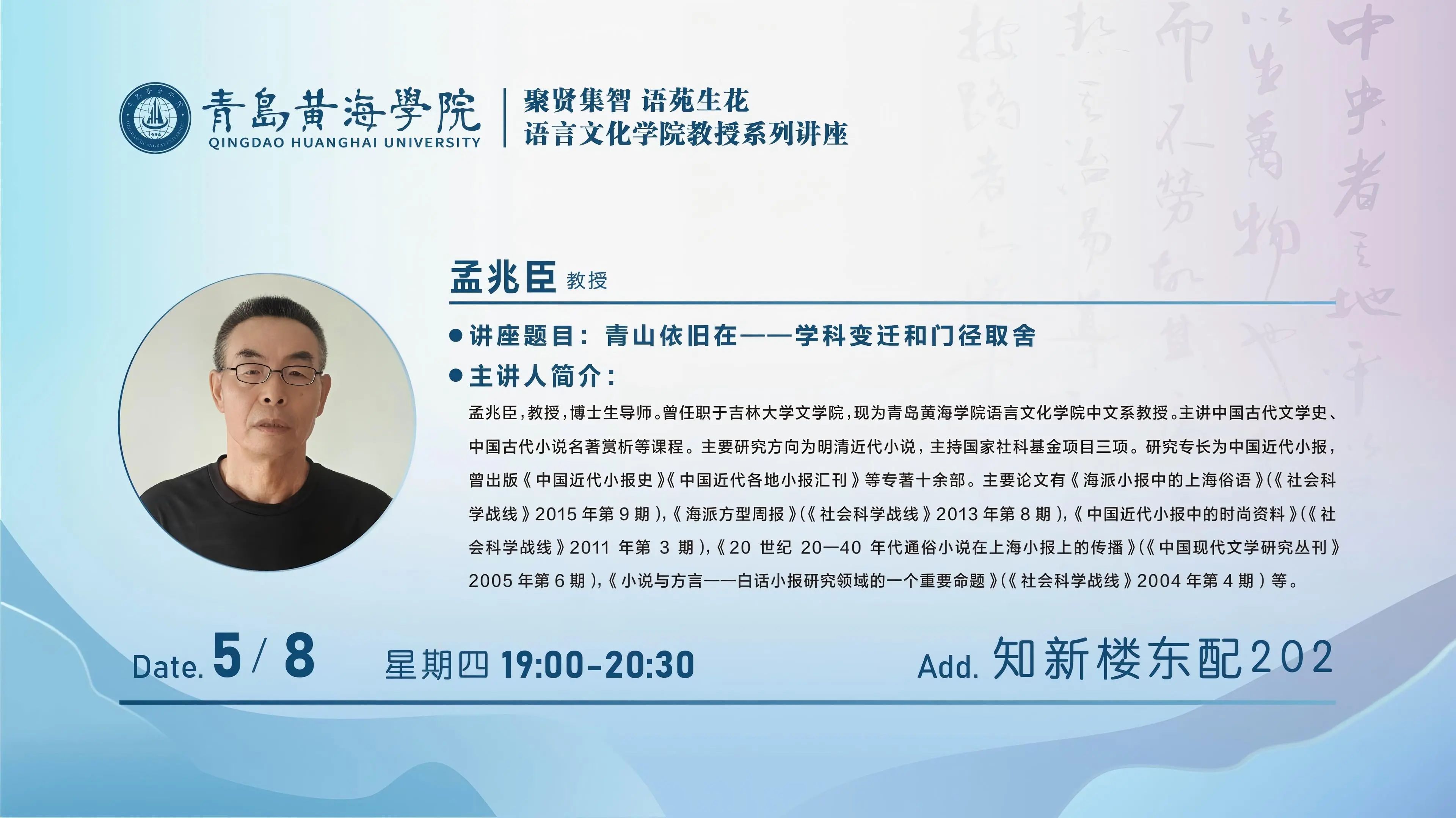 5月8日晚,语言文化学院“聚贤集智 语苑生花”教授系列讲座——《青山依旧在——学科变迁和门径取舍》在知新楼东配202教室举行。本次讲座由中文系孟兆臣教授主讲,内容涵盖文学创作、学科变迁以及学术研究等方面,吸引众多师生聆听。