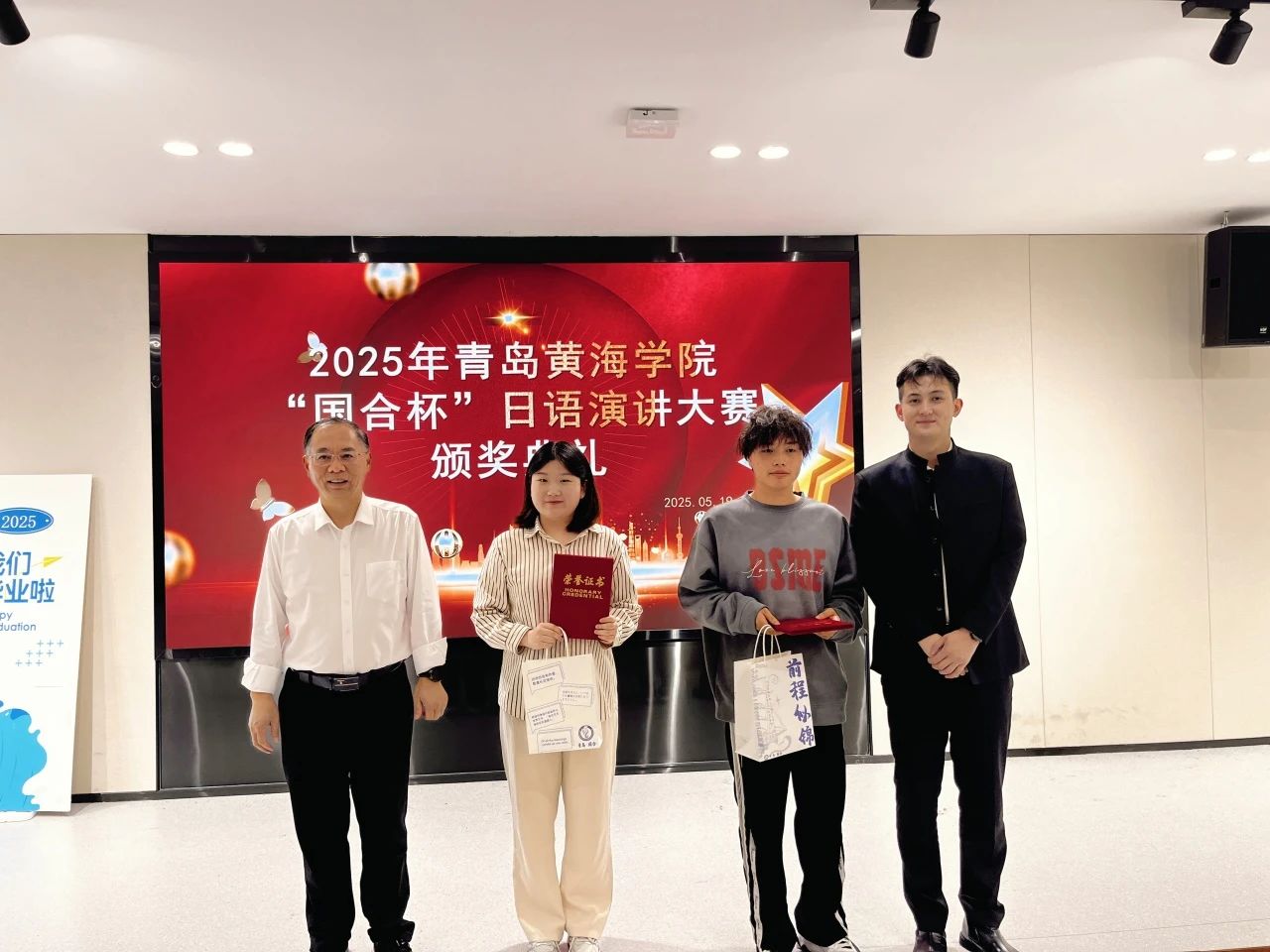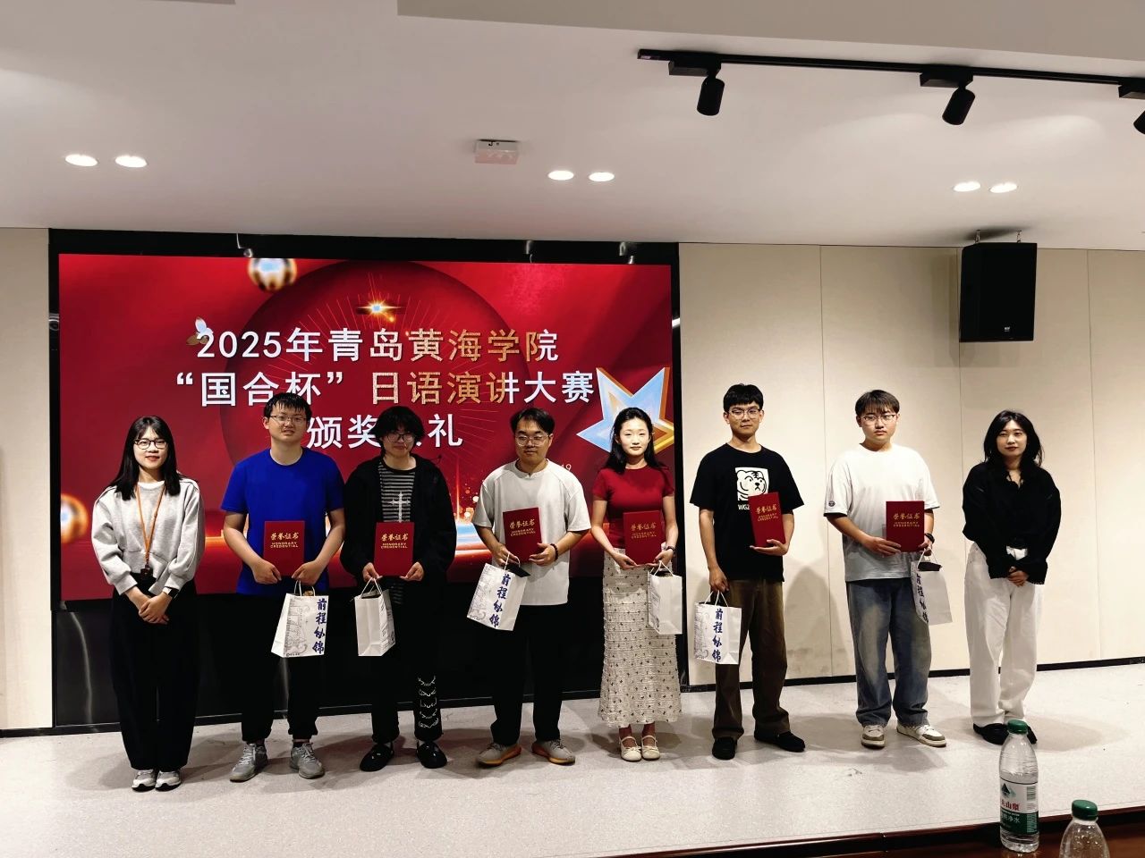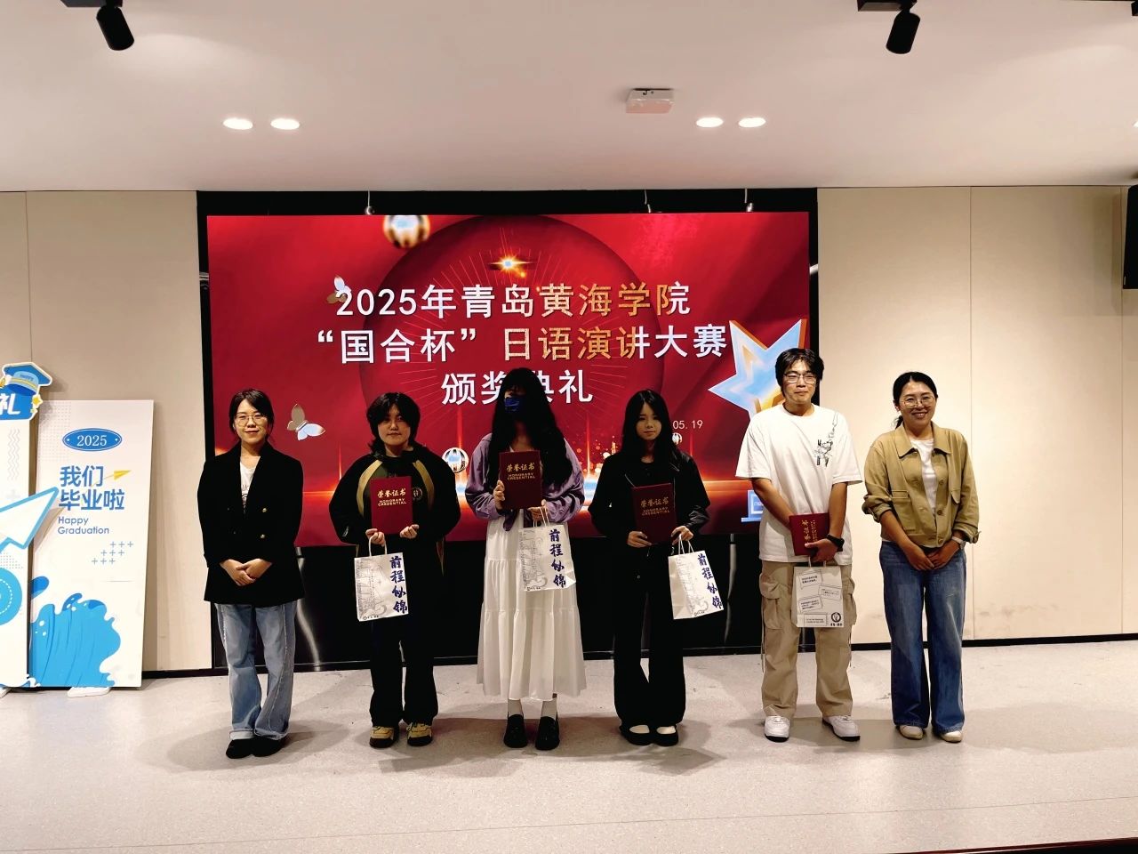 武学锋副院长、刘策总经理、日语系主任孙丽丽,以及日语系骨干教师为获奖选手颁发证书及奖品。各位获奖选手合影留念,他们分别是: