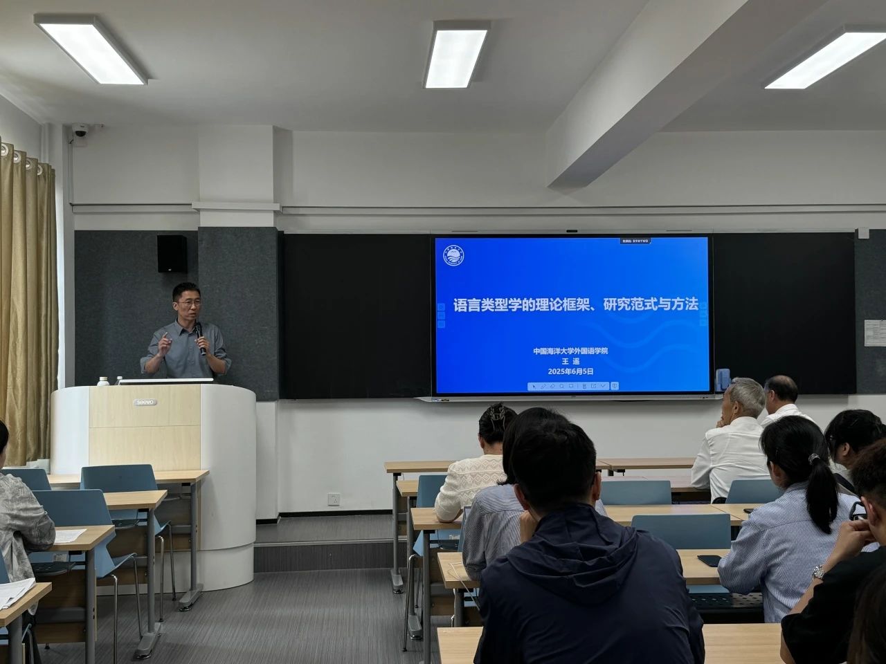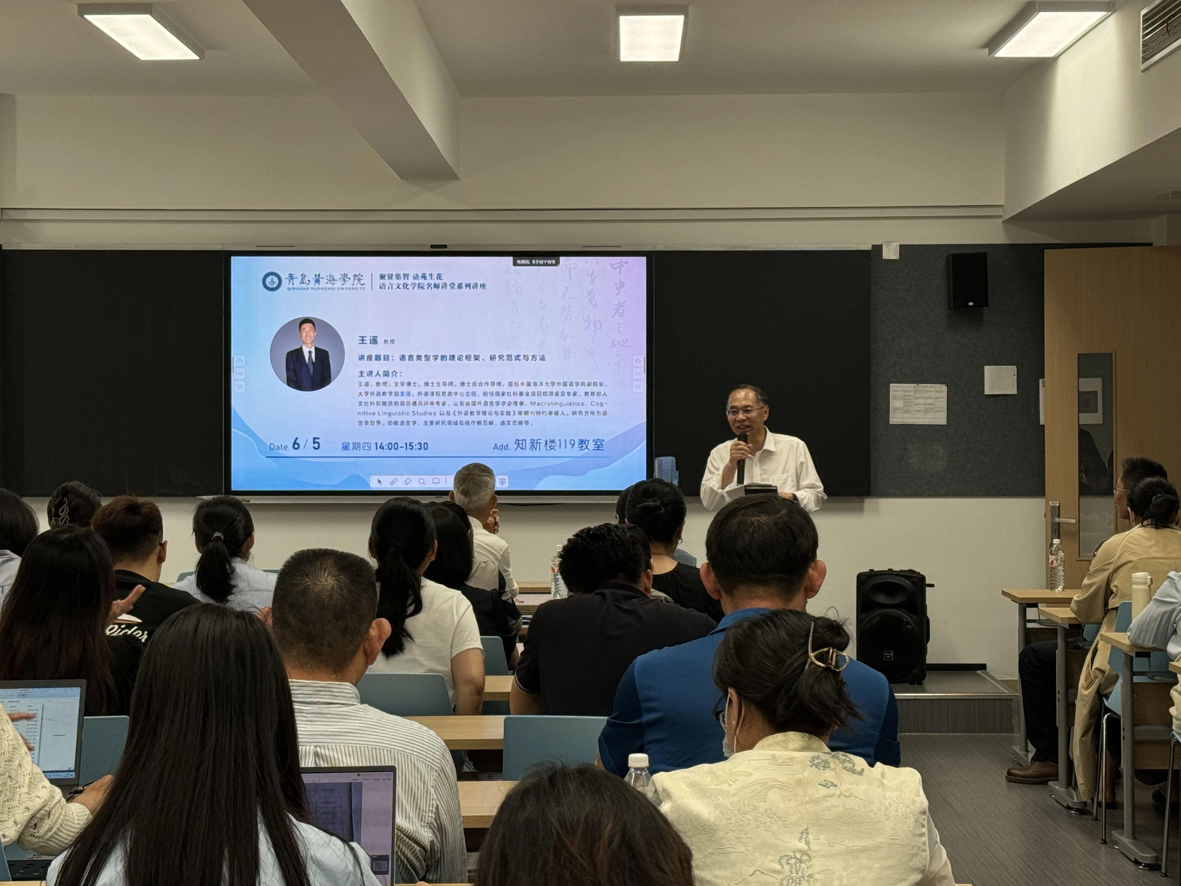 6月5日下午,语言文化学院特邀中国海洋大学外国语学院副院长、博士生导师、国家社科基金项目结项鉴定专家王遥教授莅临我校,在知新楼119教室带来了一场题为“语言类型学的理论框架、研究范式与方法”的精彩学术讲座。本次讲座由语言文化学院副院长武学锋教授主持,现场座无虚席,气氛热烈。