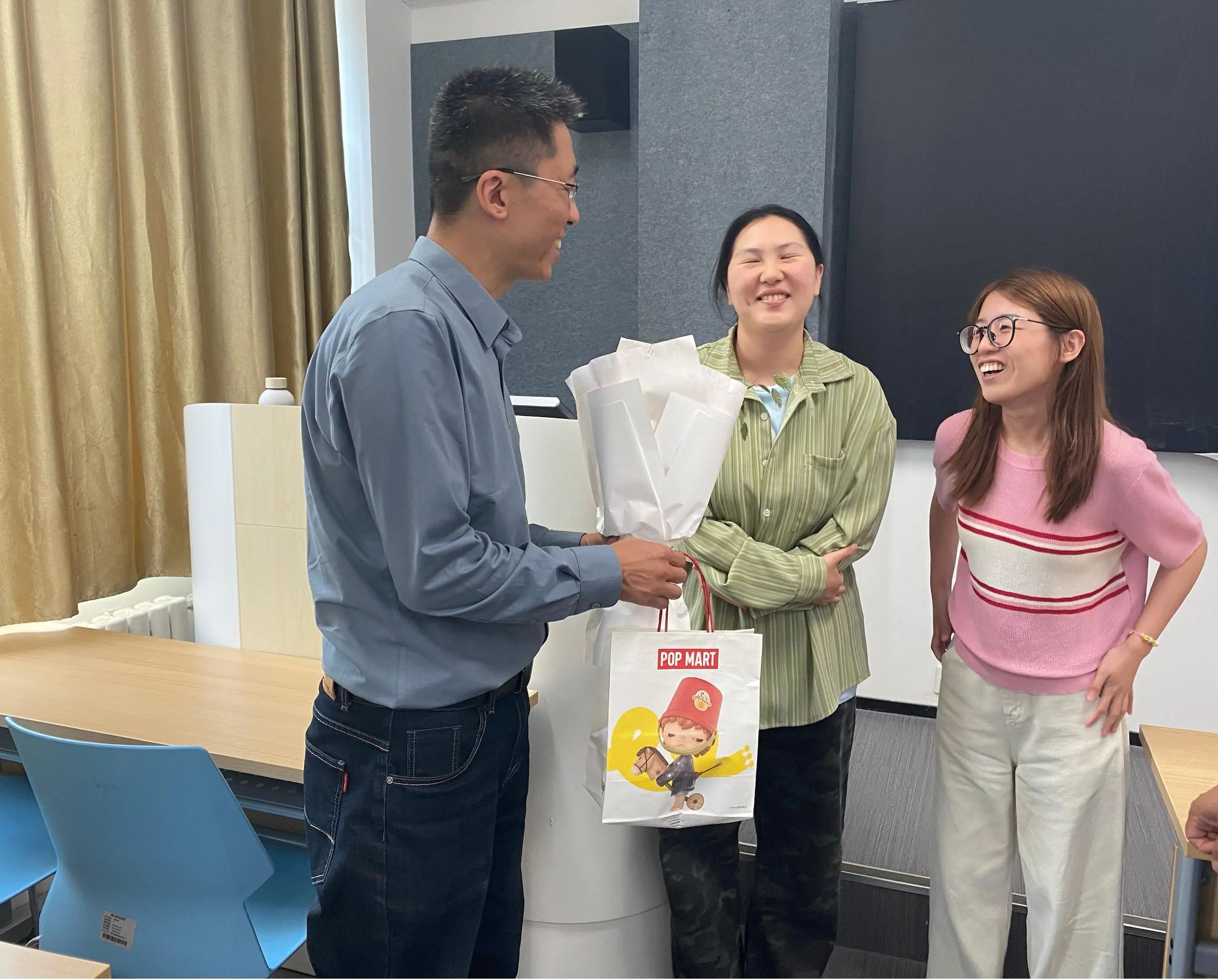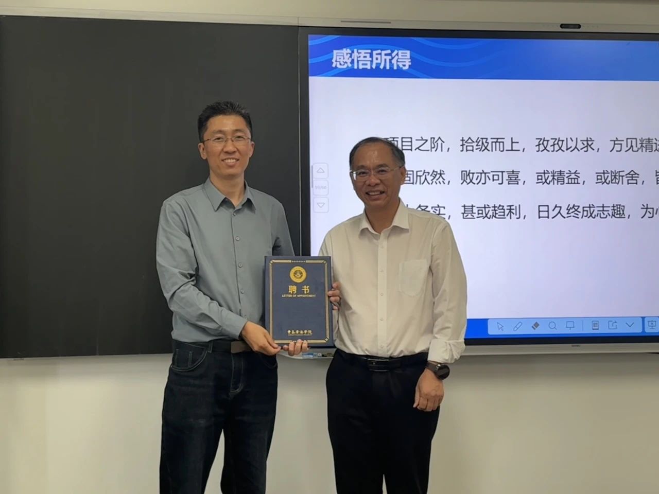 讲座结束后,现场举行了简朴而温馨的仪式。武学锋院长代表学院为王遥教授郑重颁发了语言文化学院特聘教授证书。更令人动容的是,王教授昔日的学生,如今已成长为语言文化学院骨干教师的毕晓杰和丁晖老师,满怀感恩之情,献上鲜花。这一幕温馨的师生互动,温暖了在场的每一个人。