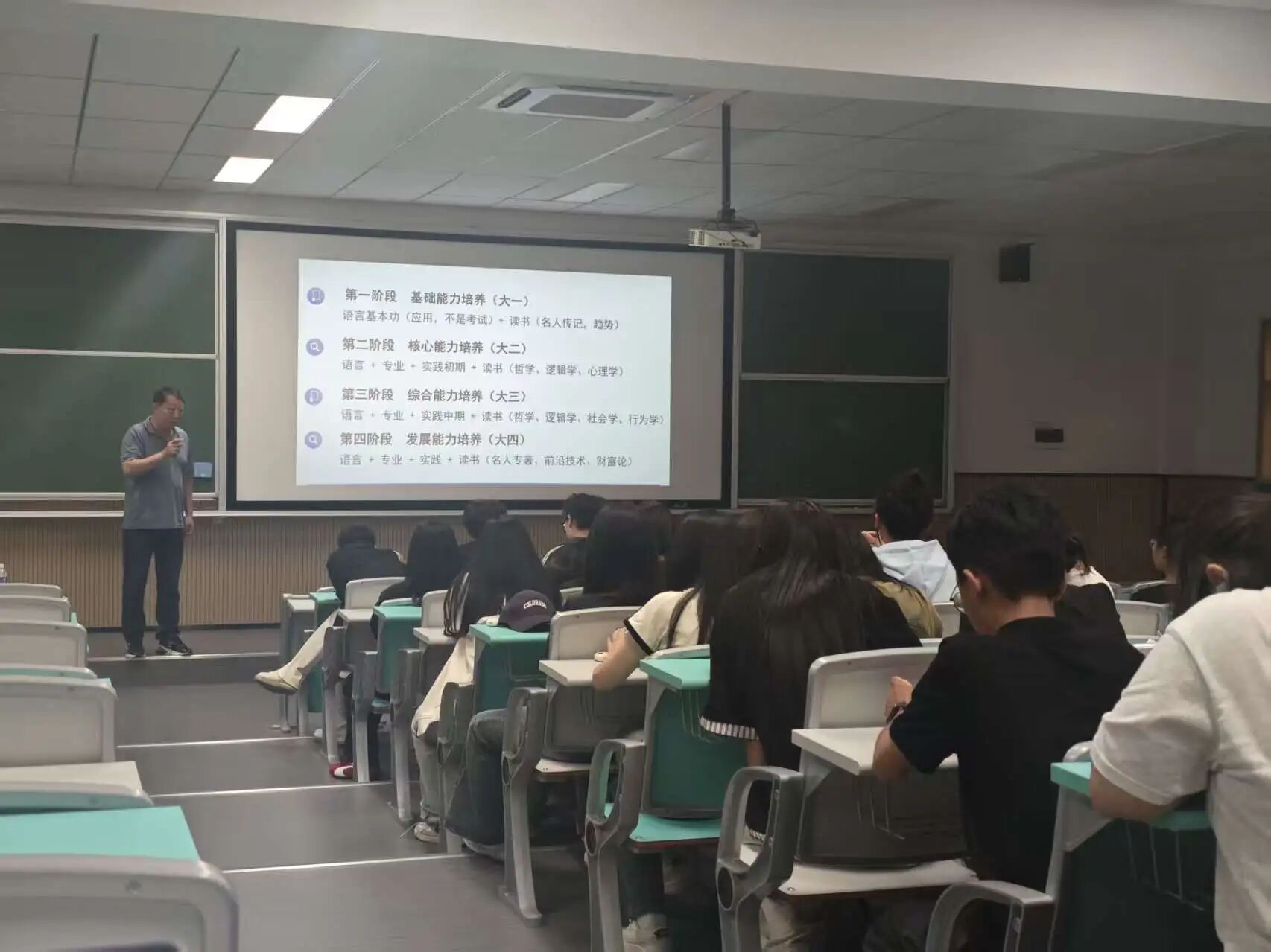 9月29日晚,语言文化学院英语系在知新楼西配201教室举办专业教育讲座,为全体2025级商务英语专业本科及专升本新生系好在黄海学习的“第一粒扣子”。讲座由英语系主任崔晓雷主持,单国谦副教授作分享。