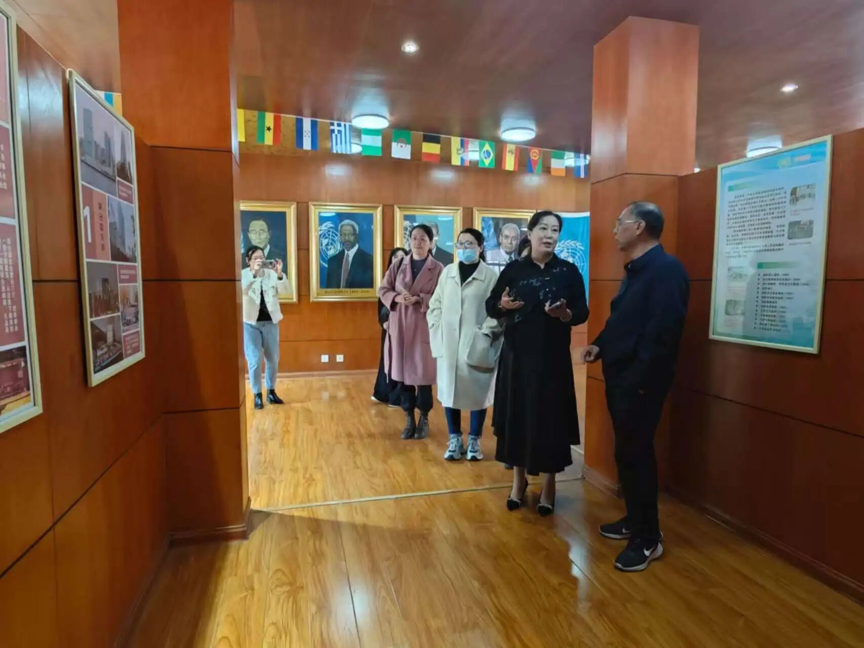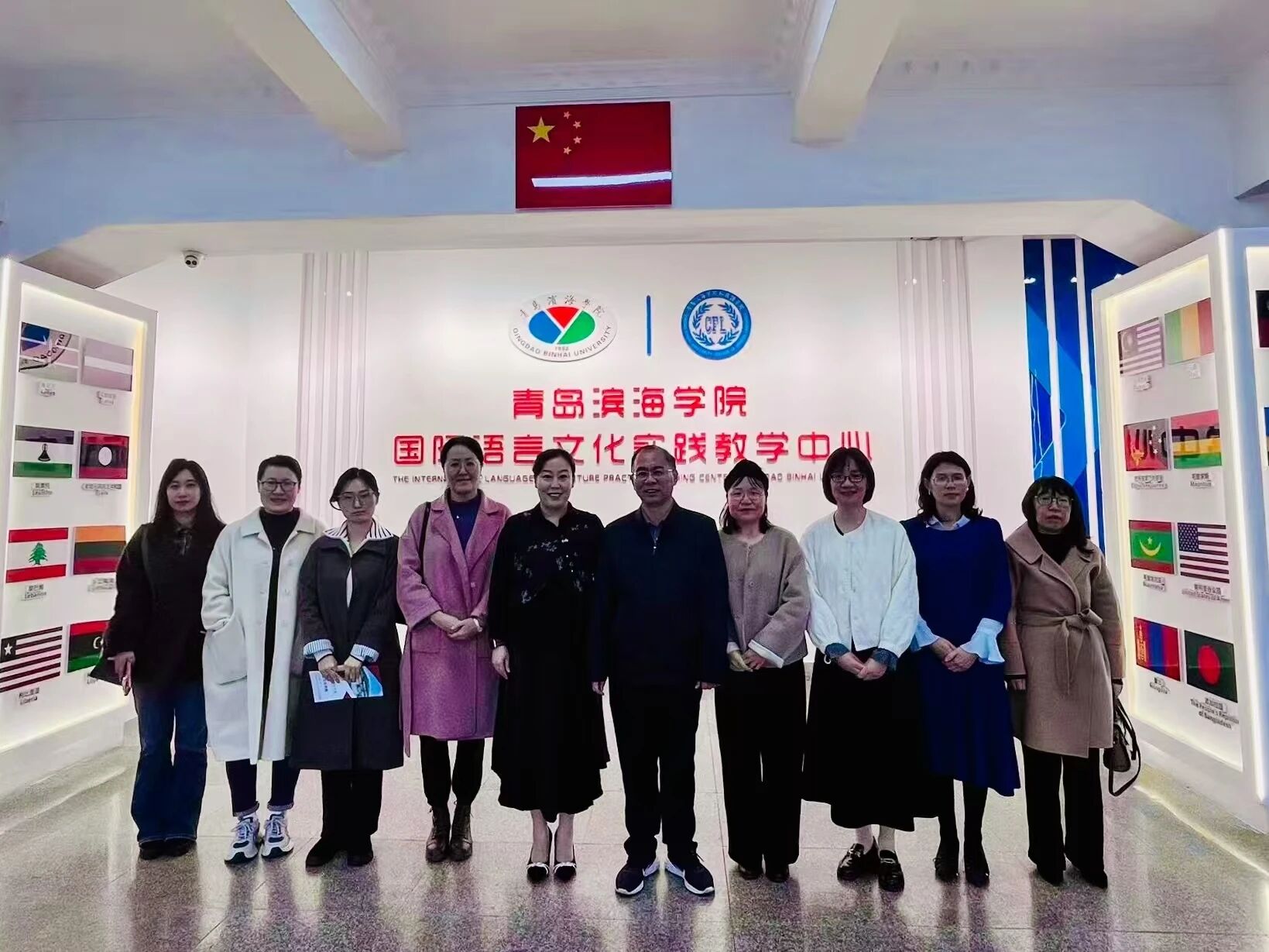 在佟若瑶院长的陪同下,访问团首先参观了青岛滨海学院标志性的国际语言文化实践教学中心——“地球村”。这座独具特色的实践基地设有“联合国”、“中国村”、“日本村”、“韩国村”、“美国村”等11个主题文化空间,每个空间都精心还原了不同国家和地区的文化场景。“地球村”不仅服务于课堂实践教学和学生社团活动,还面向社会开展国际文化科普活动,由学生志愿者服务队自主运营管理,展现了青岛滨海学院在外语实践教学领域的创新探索,访问团成员表示深受启发。