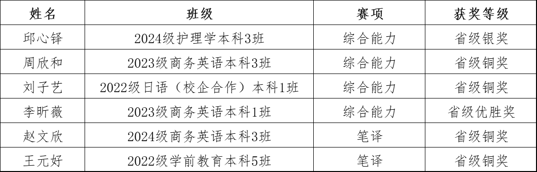 在全省81所高校328名综合能力赛项选手、79所高校155名笔译赛项选手的激烈角逐中,我校斩获省级银奖1项、铜奖4项、优胜奖1项,在获奖数量和质量上都实现了历史突破。
