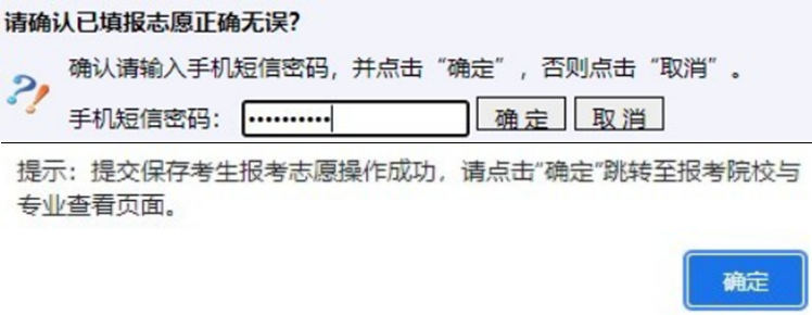 6、报考志愿确认,在报考专业选择页面,系统提示保存志愿成功后点击“确定”进入报考志愿查看及确认页面。如下图: