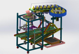 设计了一项基于PLC的全自动一体化水果套网包装机,整体由双电源系统(PLC供电、整机运动供电)、传送系统、动力系统、及外部构架等部分组成。该产品主要功能包括上传送带运输待包装水果,送网装置上的滚筒周期性旋转挤压网套至拨片,电热丝切割装置由电机带动同步带横向运动切割网套,劣果推送。为了更好的适应市场需求,传送带下部安装有称重分级机构,传送带带动已经套网的水果在行进过程中接触按压重量检测系统进行称重,气缸带动拨板移动至一侧,水果可在传送的同时由于有拨板的阻挡运动至一侧掉落,水果掉落后装箱机构接住水果,使之落入果箱之中,该机构模拟的主要是在经过套网以及分类等一系列过程之后,对已经套好网套的水果进行装箱,进而实现对水果的大小进行分类。为了避免出现坏果,碰撞果,传送过程中水果会经过水果品质检测系统,并于机器尾部加装推果机构,当出现坏果、碰撞果时拨板不会运动,水果直接传送至推果机构处,将其推送至一侧掉入坏果箱,减少人工挑选这一道程序。该产品可用于网店打包、果园包装、冷库冷藏包装等应用场景,主要用来更替以人力为主的包装流水线模式。