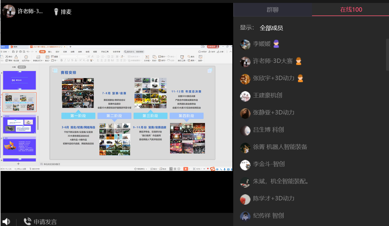 全国三维数字化创新设计大赛,为教育部列入全国高校学科评估体系,入围学科竞赛A排行榜。现已成为全国规模最大、规格最高、水平最强、影响最广的全国性科技赛事之一,被誉为“创客嘉年华、3D奥林匹克、创新设计奥斯卡”。为了能够激励智能制造学院师生踊跃参加该赛事,详细了解该赛事的相关比赛规则,能够在日后的比赛中取得优异的成绩,2021年9月16日下午3:00-4:00,邀请该赛事的主办单位全国三维数字化创新设计大赛组委会组织了一场关于该赛事的讲座。