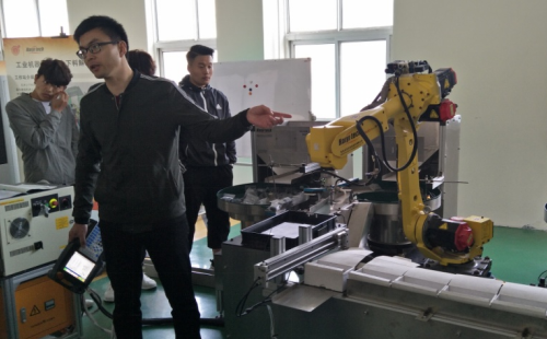 一行人受到了公司的热情接待和妥善安排,上午由王昌工程师给大家介绍了培训基地的几种类型的工业机器人,并逐一进行了演示和教学,同学们兴趣浓厚,主动地尝试操作设备,学习热情很高。下午王工给大家讲解了几种常用坐标系的原理和TCP点的标定,并指导大家操作,要求每人都要过关。同学们也都积极的操作,虚心学习请教,取得了良好的学习效果。通过本次参观实训,不仅扩展了知识面,增强了大家的动手能力,同时也激发了这个专业的学生的学习热情,在现有学校实验设备不足的情况下,取得了良好的实训效果。