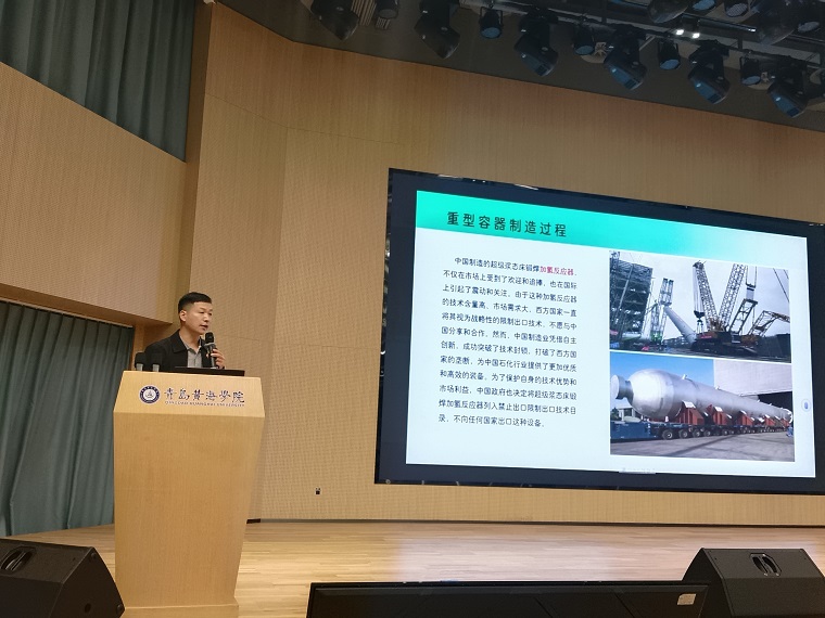 报告会上,孙工结合企业实际生产,详细介绍了大型压力设备的封头制造、筒体制造、接管制造、弯管制造及装配过程等制造工艺知识。通过报告让学生深刻体会大国重器对国家经济发展的促进作用,充分了解大型设备的不同材质及规格等产品信息以及相关制造工艺知识,了解了机械制图、工程材料、机械制造工艺等专业知识的具体应用,意识到学好专业知识的重要性。