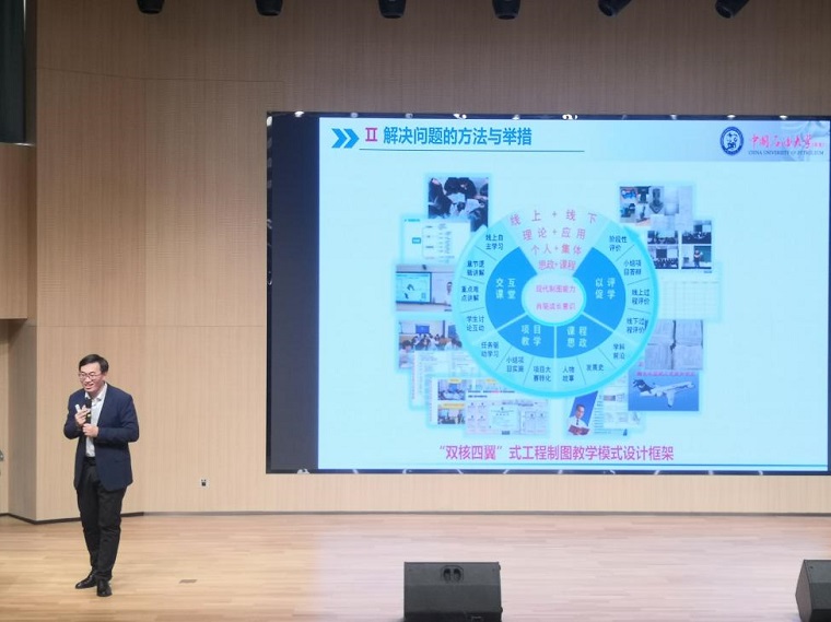 为让教师们更直观地理解教学改革的具体实施,张教授以《工程制图》课程的教学改革创新为例,展示了如何将信息化教育改革与传统工程图学课程相结合,通过构建“学-明-悟”的互动课堂模式,激发学生的自主学习潜能,有效解决“难学、难想、难用”问题,提升课程教学质量。关于课程思政,张教授强调,思政元素的融入应做到“入微”、“入味”、“入心”。教师在授课过程中要巧妙地将思政内容与专业知识相结合,让学生在潜移默化中接受正确的价值观引导。