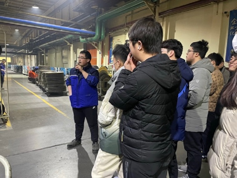 随后,在TBR品质技术部压出工程师付尚和成型工程师刘浩的带领下,学生到半钢产线和全钢产线的半成品、成型硫化车间参观了轮胎生产过程。车间的硫化气味较重,参观期间工程师全程强调注意安全。通过参观学生对生产工艺有了更全面的认识,感受到了轮胎成型机械的每个部件运动情况,对三维模型转化有了更深的印象。此外学生了解到,轮胎生产车间内主要有半钢一次和全钢二次法的成型机,在生产中如果有遇到问题,可以及时反映到软控各部门,这极大地方便了技术研发和生产管理。