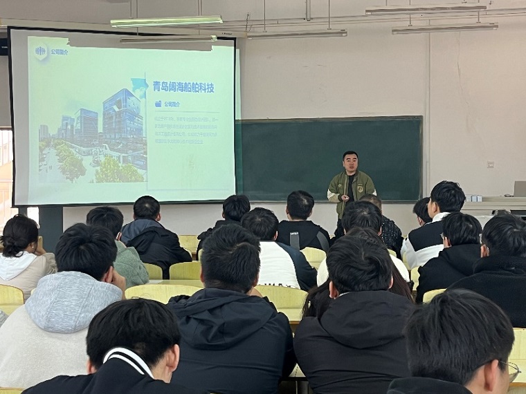 青岛阔海船舶科技有限公司副总经理李朋鹏从公司简介、企业荣誉、公司团队、业务模块、合作客户五方面为船舶与海洋工程专业毕业班学生做企业招聘宣讲,对学生的就业疑问耐心细致的解答,为学生未来就业提供了宝贵的意见。