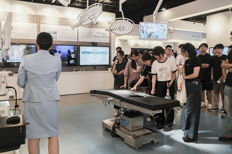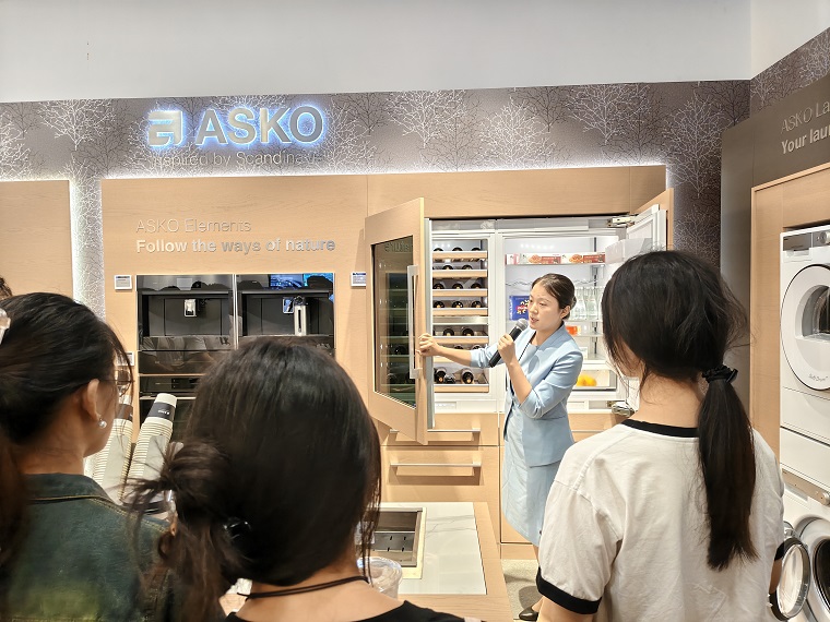 活动分为三个核心环节,层层递进深化学习效果。首先,在参观学习中,学生们在海信研发展厅工作人员的带领下,深入了解了海信集团的技术创新与产品研发历程。展厅内展示了智慧家居场景的完整生态,包括ASKO高端套系的嵌入式家电,如冰箱、酒柜、洗碗机、洗衣机、衣物护理机和厨电等。